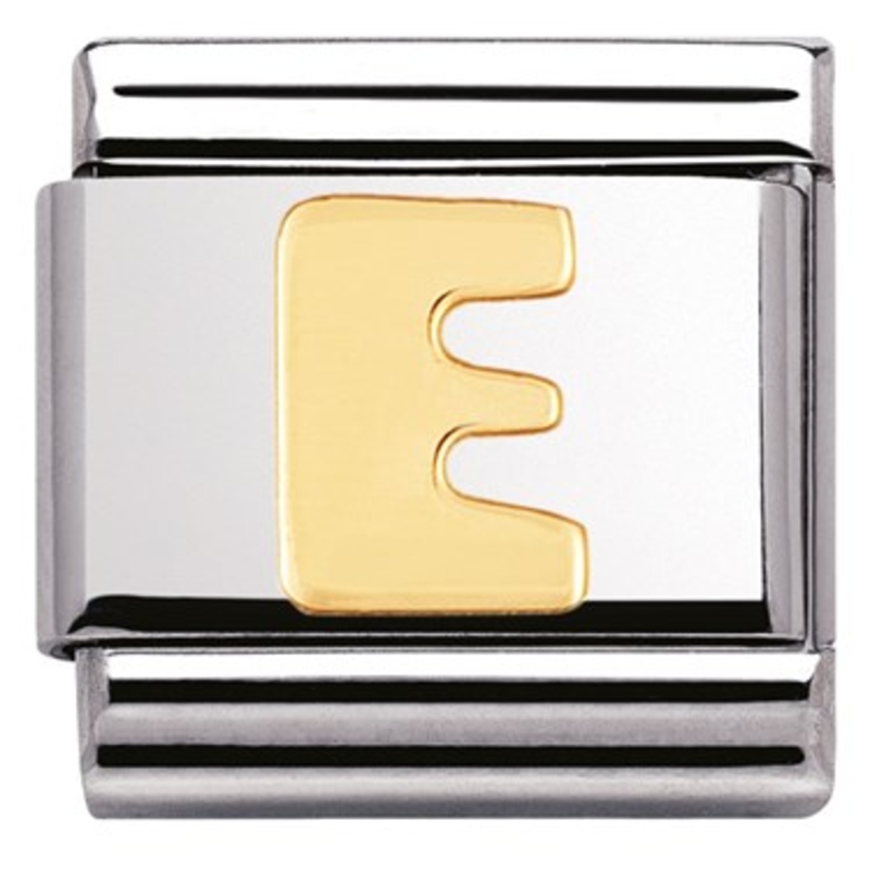 Nomination E Charm. Charms. An inspiring letter E charm that is crafted from stainless steel & embellished with contrasting 18ct gold. Wear it to symbolise the first initial of your name or choose several to spell out a word or a name that is special to you..