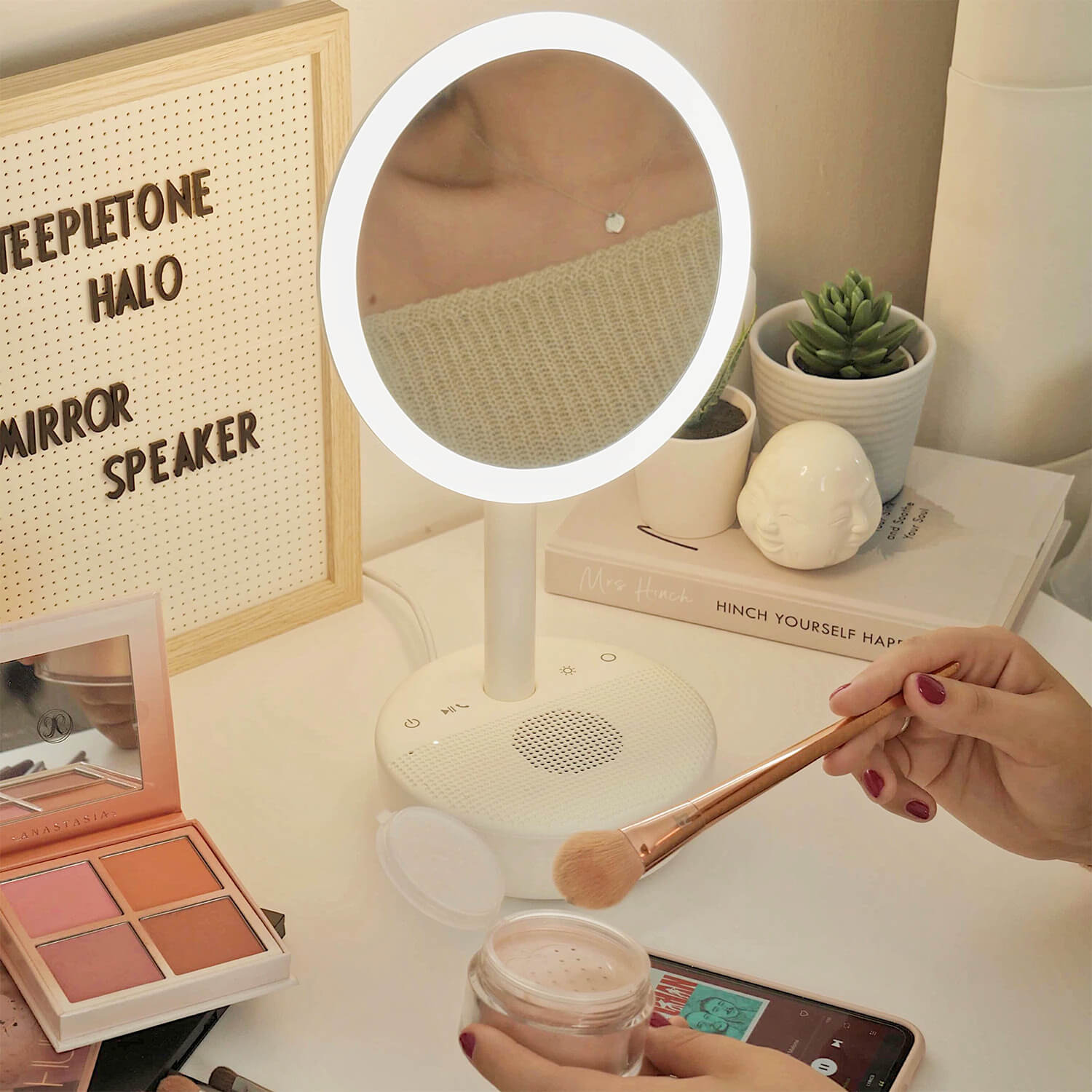 - the gorgeous soft off white/cream colour is subtle & will blend in with any décor! Say goodbye to multiple items on your dressing table, instead say HALO to the Halo it really does it all! As well as the amazing ring light that can be dimmed or brightened by the touch of a button, the mirror itself flips into a desk light which is a soft white/yellow colour perfect to light up a room. The Halo is a gift unlike any other product on the market, the amazing sound quality means you can listen to your favourite music or radio simply by connecting your phone or tablet via Bluetooth. With the added feature of the built in microphone, you can talk hands free on the phone while getting ready... so you'll never be late again. The HALO is slick & seamless to use & is taking a step into the future..treat yourself or your loved ones today.