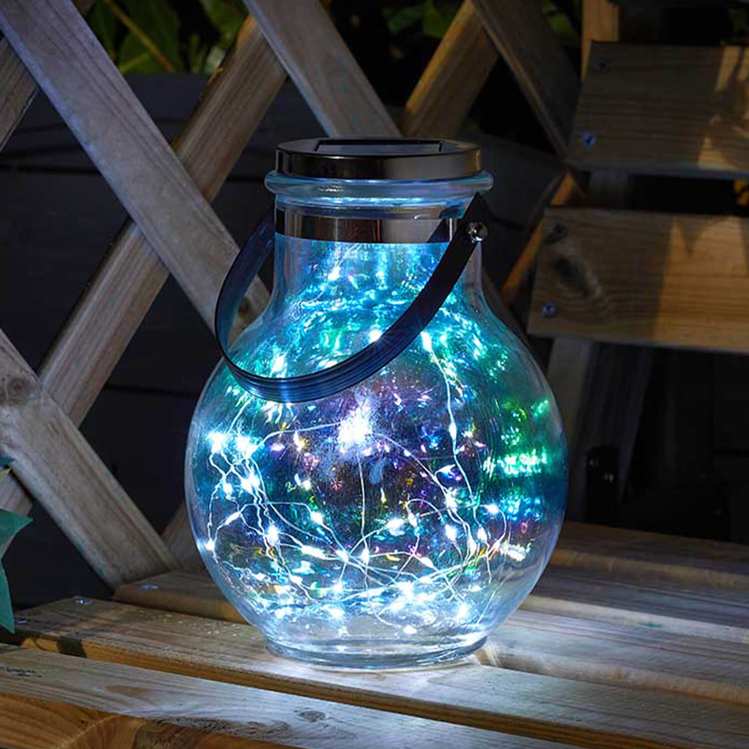 Pair of beautiful iridescent glass lanterns with firefly LEDs stunning pearlescent iridescent firefly Opal effect Can be hung or used on a table top Automatically illuminates at dusk Charges in direct sunlight 22 x 16 cm