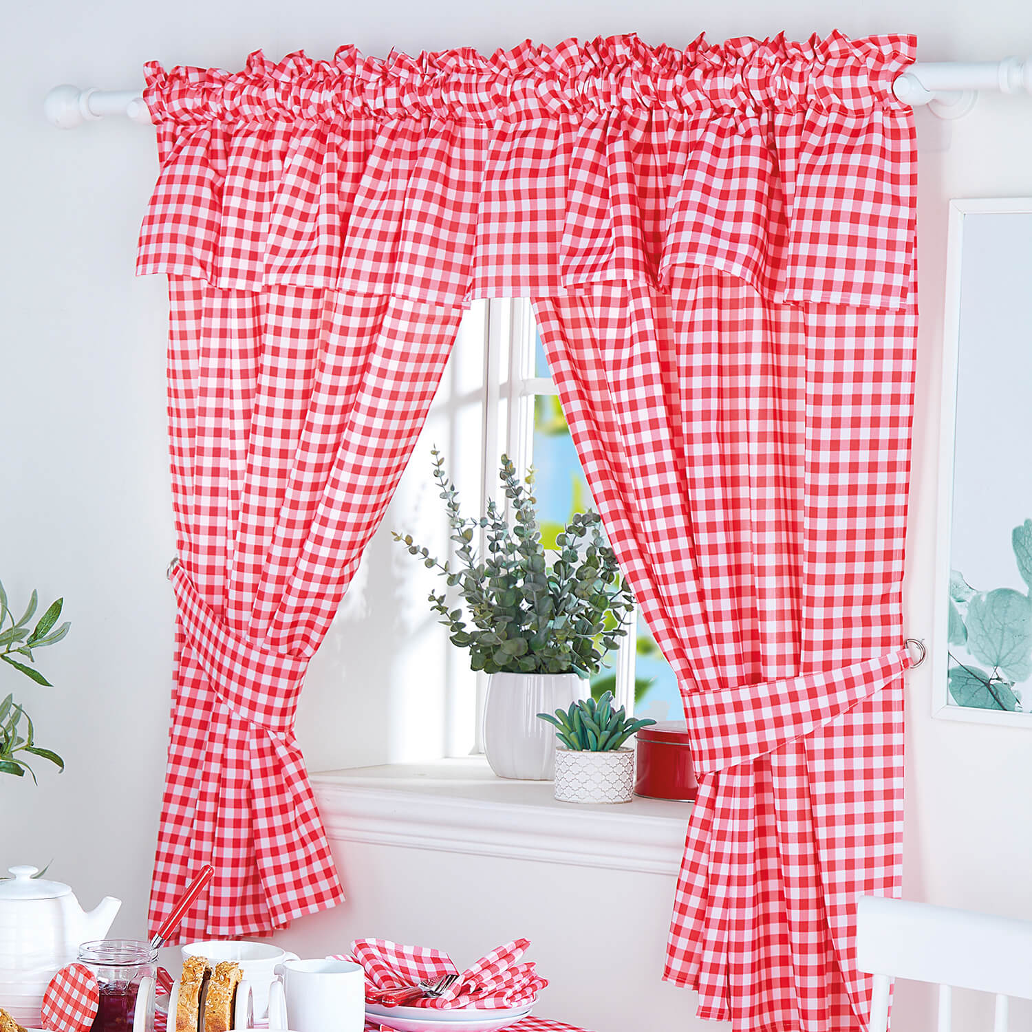 Co-ordinated country gingham for the heart of your home Matching tablecloths, napkins and curtains It’s the heart of the home; where we gather, eat and entertain, and these bright and cheerful ginghams embody everything your kitchen should be. Gorgeous, washable tablecloths in 3 sizes, with matching napkins and curtains with integrated valances, which effortlessly co-ordinate the look. 100% polyester.