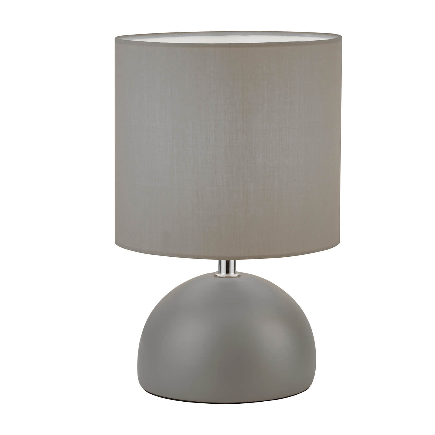 Grey table lamp with trendy dome design and soft tactile effect shade. Dimensions: L16.5 x W16.5 x H25.5cm Bulb Type = E14. Bulb Included = No