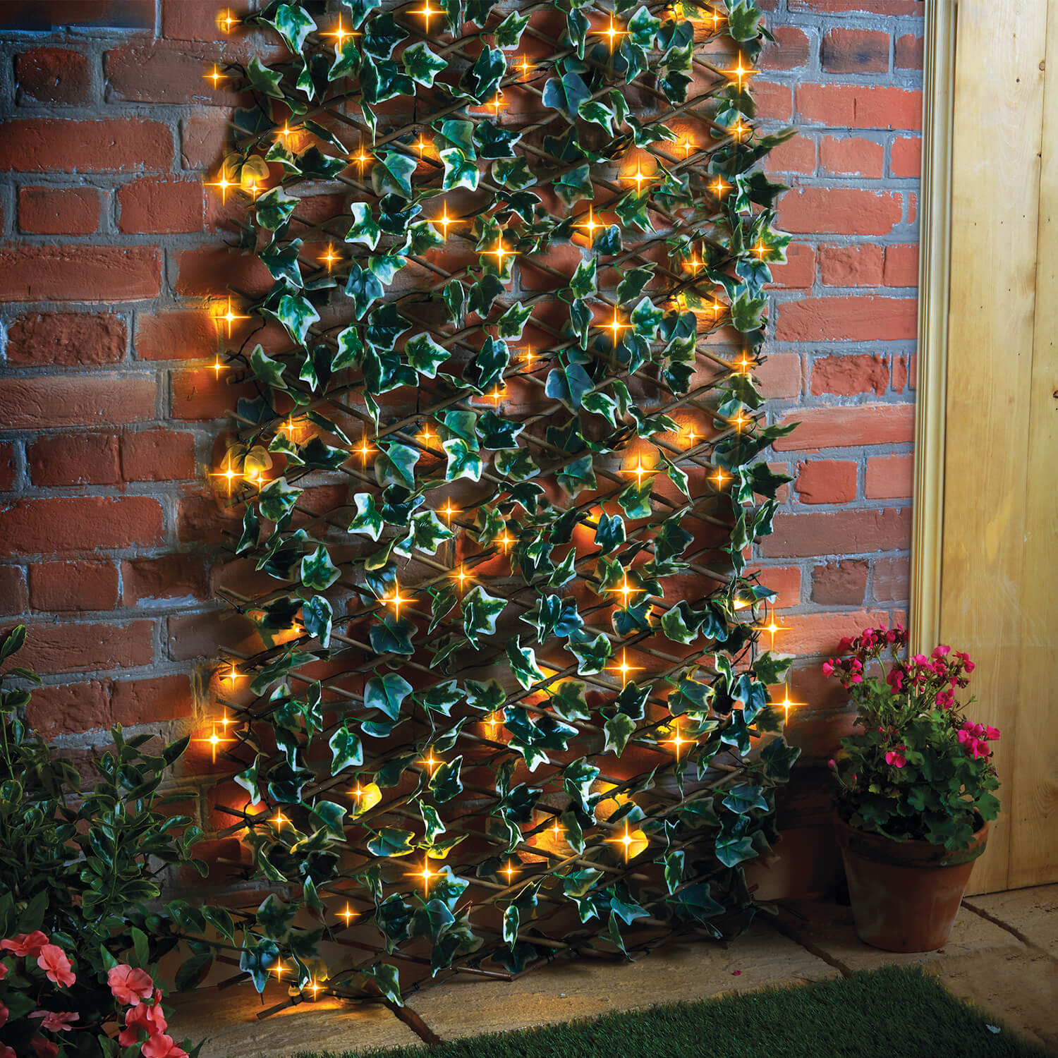 Luxurious evergreen trellis instantly glams-up dreary walls & fences ‘ Growing’ on its own extendable willow trellis, with a solar panel that can be placed up to 3m away to charge, this realistic, variegated ivy is great for shady spots where plants normally struggle to thrive. At dusk every night, the ivy illuminates automatically with 50 warm white LEDs! Fits spaces up to H60 x W180cm, horizontally or vertically.