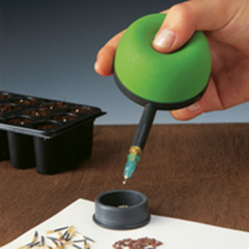 This clever ' Pro-Seeder' uses the same suction technique commercial growers have used for years. Simply choose the correct colour-coded needle, empty the seed into the storage cap provided & squeeze to release as you plant. saves your valuable time, seeds & lots of fiddly work. Length 10.8cm (41/4). Complete with three nozzles & guide notes.