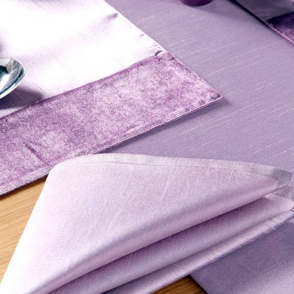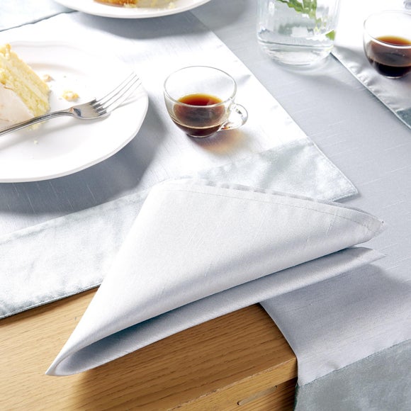 Available in a choice of two colours with a subtle velvety sheen, this pack of four table napkins will add a hint of colour to your dining table. ? Two colours available? Available in a pack of 4? Polyester faux silk napkins? Machine washable Place these fabric napkins onto your dining table, designed with a subtle sheen finish, to give your dining room setting an elegant finish. Available in a pack of four, these velvety napkins will protect your clothing & wipe away any spillages or stains from your dining table. Made from durable polyester with a faux silk finish, these soft napkins are easy to clean by giving them a quick machine wash, making them ideal choice for everyday use. Ask Dunelm a question Brand Dunelm Colours available Duck Egg (Blue), Lilac (violet) Composition 100% polyester faux silk Drying instructions Tumble dry on a low heat setting Ironing instructions Iron on a cool setting Material Polyester faux silk Pack size Four napkins Pattern Patterned Sizes available One size available in 40cm x 40cm (16" x 16") Washing instructions Machine washable ...