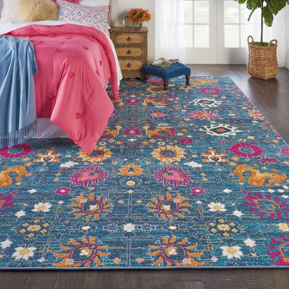 Imaginative flowers in lush & saturated pigments grace this Passion collection of rugs with a beautifully colorful presence. The artful palette mixes fuchsia, petal pink, apricot & lemon on a patinated background of denim blues. These fantastic florals & geometric designs combines hints of Persian antiquity in a modern interpretation to create a stunning & versatile statement piece. Skillfully woven Polypropylene fibers on state-of-the-art power looms combines thick, comfortable pile with an easycare approach. Advanced overdye techniques create an exciting patina effect in shades of pink, blue, & orange. Made from high quality polypropylene, it has been master batch dyed for lasting colour fidelity, expertly woven to Nourison’s superior quality standards on proprietary powerlooms, & finished with a practical jute & latex backing. To ensure your rug lasts, gently vacuum on a weekly basis to remove surface dust & dirt. Do not pull any loose threads, cut carefully with scissors to remove. Occasionally rotate the rug to equalise wear & avoid prolonged exposure to direct sunlight. Clean spills immediately by blotting with a clean cloth. Do not rub. If stain persists, seek professional cleaning. Please note, unfortunately we cannot deliver this item to the Channel Islands. Don’t forget to buy our anti-slip mat [here] (http://www.dunelm.com/product/rug-anti-slip-mat-1000002949), available in a choice of sizes. ...