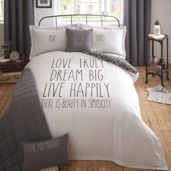 Crafted from soft & durable polycotton, this duvet cover set has a natural base & features printed messages in grey while the reverse has a grey base & natural print text. Available in a choice of sizes, our duvet set comes complete with pillowcase (s). ...