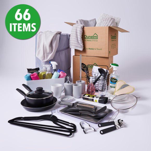 In this outstanding Ultimate Student Starter Bundle, specifically for single bed accommodation, you can expect to be kitted out from kitchen utensils, bathroom bits, cleaning & bedding. In detail, this will include: Kitchen:* 1 x Scoville Peeler * 1 x Handy Kitchen Coarse Hand Grater* 1 x Dunelm Nylon slotted turner* 1 x Dunelm Nylon solid spoon * 1 x Dunelm Nylon slotted spoon * 1 x Dunelm Nylon ladle* 1 x White Chopping Board* 1 x Dunelm 32cm Oven Tray* 1 x Essentials 20cm Stainless Steel Sieve* 4 x Essentials Highball Glass* 1 x Brabantia Tasty+ Grey Can Opener Plus Bottle Opener* 1 x Set of 5 Terry Tea Towels* 1 x Dunelm Essentials 28cm Fry Pan* 1 x Dunelm Essentials 20cm Saucepan* 1 x Dunelm Essentials 16cm Saucepan* 1 x 12 Pc White Porcelain Dinner Set* 4 x Purity Mugs* 1 x Teal Ice Cube Stick Tray* 2 x Essentials Wine Glass* 2 x Essentials Beer Glass* 1 x Clip Top Large 2.2L Food Storage Box* 1 x Clip Top Medium 900ml Food Storage Box* 1 x Clip Top Small 450ml Food Storage Box* 1 x Black Double Oven Glove* 1 x Dunelm 30cm Deep Oven Tray* 1 x Dunelm 31cm Pizza Tray* 1 x Red Chopping Board* 1 x Green Chopping Board* 1 x Dunelm 1.7L 3KW Black Kettle* 1 x Dunelm Black 2 Slice Toaster Cleaning:* 1 x Astonish Specialist Kitchen Cleaner* 1 x Antibacterial Dual Microfibre Scrubbers * 1 x Sorbo Pack of 6 Bubblegum Microfibre Cloths* 1 x Method Grape 354ml Hand Soap* 1 x Pack of 20 Brabantia Perfect Fit 30L Bin Bags* 1 x Method Anti-Bac All Purpose Cleaner Spray * 1 x Method Hard Floor Cleaner * 1 x Addis Rectangle Bowl* 1 x Dunelm Dish Brush* 1 x Medium Rubber Gloves* 1 x Utility Room Non Scratch Sponge Scourers* 1 x Wire Matt Black Dish Drainer Bedroom:* 1 x 5.02 Studio Plastic Storage Basket* 1 x Recycled Plastic 48L Hipster Laundry Basket* 1 x Pack of 50 Black Flocked Hangers* 1 x Grey Plain Dye Single Duvet Cover Set* 1 x Non Iron Plain Slate 28cm Single Fitted Sheet* 1 x Non Iron Plain Dye Slate Pillowcase Pair Bathroom:* 2 x Soft Grey Ultimate Hand Towel* 2 x Soft Grey Ultimate Bath Towel* 1 x Silver Mini Bobble Bathmat * 1 x Ribbed Silver Lotion Dispenser* 1 x Ribbed Silver Tumbler* 1 x Ribbed Silver Soap Dish * 1 x Ribbed Silver Toilet Brush* 1 x Black Wire Storage Basket Please Note: The Laundry Basket in the picture is different from the one you will receive ...