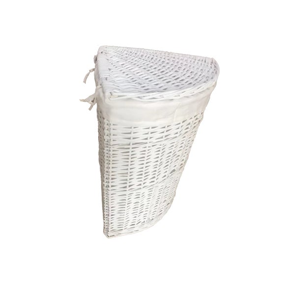 Crafted from hand woven wicker with a fabric liner, this white painted basket has a space saving corner fitting design with a hinge lid to keep things securely stored away. Available in two sizes. ...