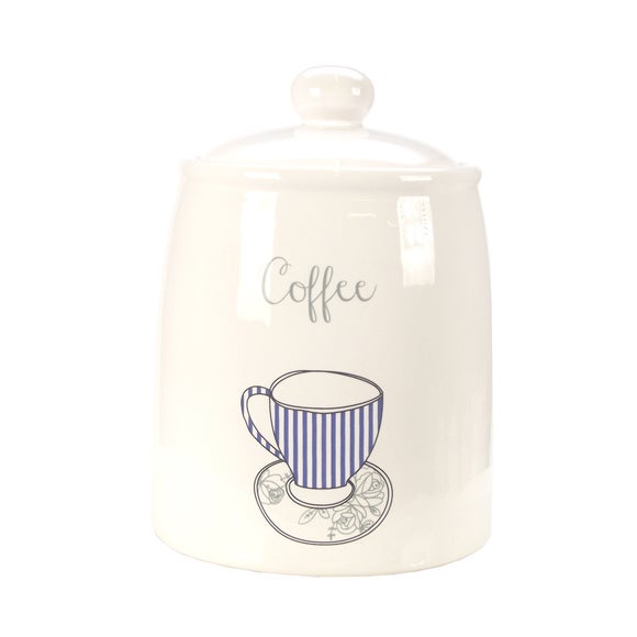 Available to purchase online today, our vintage white coffee canister will add a touch of simple style & practical use in your kitchen. Enjoy a hot drink with our teacup patterned kitchen canister Keep your coffee granules close to hand in the morning with our white coffee jar, featuring a stylish illustration of a blue stripe tea cup on a neutral backdrop with the word " Coffee" beautifully scripted for a look that will fit into almost any kitchen decor. Our durable coffee canister will look outstanding displayed on your work surface or shelves, a practical addition to help organise your kitchen while adding a touch of style. Complete the look of your kitchen by matching our white coffee container with other storage jars from the Vintage Tea Cups Collection, available to buy separately. Please note: This product is subject to stock availability. Ask Dunelm a question Brand Dunelm Care instructions Wipe clean with a damp cloth Category Coffee Canister Colours available One colour available in White Dishwasher safe Not suitable Material Earthenware Pack size One canister Sizes available One size available in Dia. 11cm (4") x H 15cm (6") ...