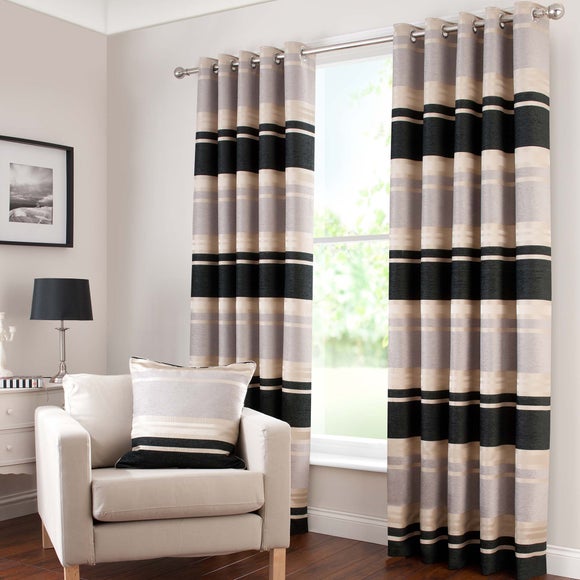 Dress your windows in style with our elegant lined curtains with their striking black striped design, available to buy online today in a range of sizes. Our quality readymade curtains will bring style to your living area Our heavily woven window dressings feature a series of horizontal black & silver stripes that are broken up by thin lightly textured cream stripes, perfect for creating a bold design statement for your home. The durable polyester fabric is woven to create a rich textured feel that adds to the luxurious look & feel of these stylish drapes. Installing our eyelet curtains is easy & hassle free Using the strong inbuilt metal eyelets, installing these drapes onto your curtain pole couldnt be easier & will take you a matter of minutes. With a thick inbuilt polyester lining, our readymade curtains are a great way to block out the suns rays & provide you with the privacy you want in the evenings. Available in a range of width & drop sizes, you wont have a problem finding the right fit for your room, plus these quality striped curtains can be coordinated with our black striped Portobello cushion to help complete the look of your room. Please note: This product is subject to stock availability. Ask Dunelm a question Brand Dunelm Colours available One colour available in Black Composition Face 100% polyester, Lining 100% polyester Curtain type Eyelet Lining Lined Material Polyester Pack size One pair of curtains Pattern Patterned Sizes available W 117cm (46") x Drops available 137cm (54"), 182cm (72"), 228cm (90"), W 168cm (66") x Drops available 137cm (54"), 182cm (72"), 228cm (90"), W 228cm (90") x Drops available 137cm (54"), 182cm (72"), 228cm (90") Style Striped Washing instructions Dry clean ...