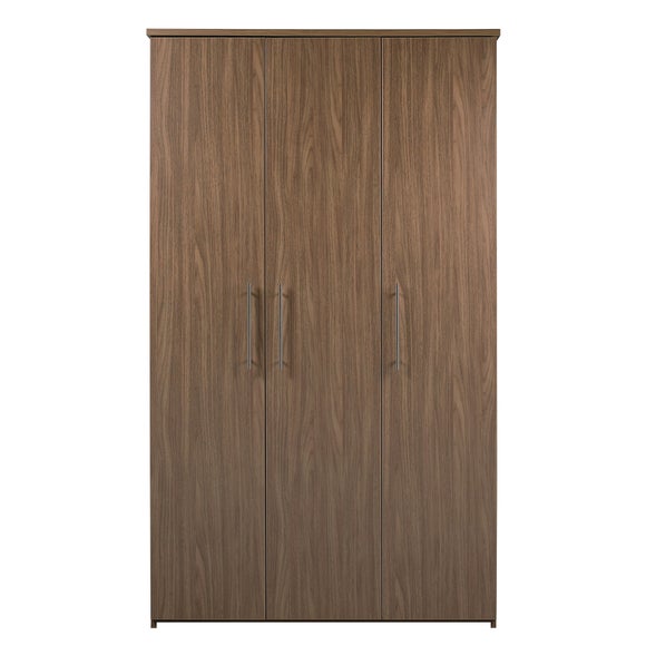 With a dark walnut effect, our walnut triple wardrobe provides ample storage space for both hanging & folded clothes.- Self assembly required- Three hanging rails at different heights- Two internal shelves- Sleek steel handles Made from durable MDF & covered with an authentic, grained dark walnut finish, our large wardrobe provides ample storage space for your clothes. Featuring three hanging rails at a range of heights, you can easily split your clothes into casual & formal clothes or longer coats & dresses. With two internal shelves, you can also store folded clothes in this spacious storage unit. Finished with sleek steel handles, this walnut effect wardrobe is simple to assemble with the easy to follow step by step instructions. Assembly instructions Assembly Full assembly required Brand Dunelm Care instructions Wipe clean with a soft cloth Colours available One colour available in Walnut (Brown) Finish Walnut Material MDF, foil faced particle board, steel Pack size One wardobe Sizes available One size available in W 118cm (47") x D 50cm (20") x H 200cm (79") Storage Triple wardrobe ...