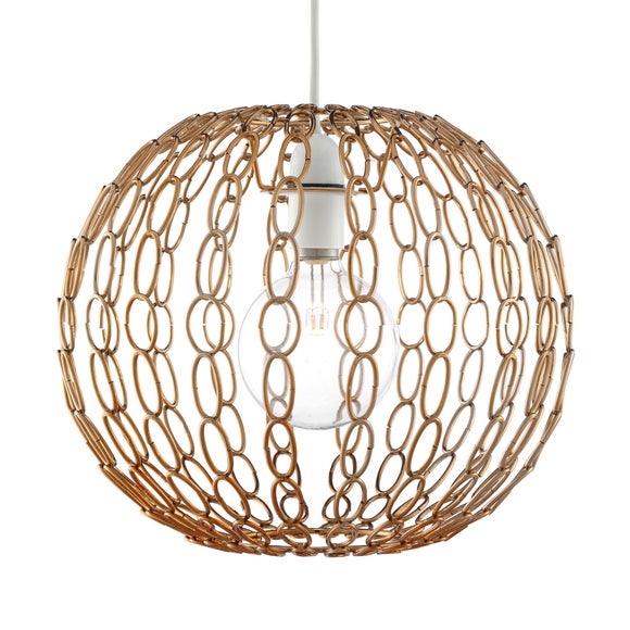 Created with a metallic chain link design, this decorative pendant offers a modern alternative look to your lighting & allows plentiful light through.• Metallic chain link design• Made from mild steel• Choice of colours available Crafted in a classic spherical shape composed of chrome vertical chain links, this robust pendant adds a contemporary look to your décor & allows plentiful light through the gaps for comfortable lighting around your room. Durably made from mild steel for long lasting use, this modern light shade is available in a choice of colours to suit your requirements. Brand Dunelm Care instructions Wipe clean with a soft cloth Colours available Chrome, Gold Material Mild steel Pack size One pendant Sizes available One size available in Dia. 30cm (12") x H 26cm (10") ...