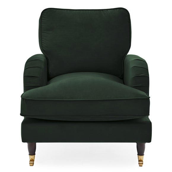 The Rupert Velvet Armchair would make a charming addition to your home with its vintage design & shape. This part assembly armchair is as comfortable as it is attractive, with its generously filled foam & fibre cushions & stunning pleated arm design. Available in a range of colours, this armchair features dark, solid wood legs & brass-finished castors allowing for easy movement. Care Instructions: Wipe fabric regularly with a soft cloth to remove dust & avoid prolonged exposure to direct sunlight. Wipe legs clean regularly with a damp cloth.[ Click here to view the full Rupert range] (https://www.dunelm.com/search?f_attributes.product Descriptive Attributes. Department= Upholstered+ Furniture&q= Rupert)[ Click here] (https://www.dunelm.com/infodocs/downloads/ Furniture-Sizing-Guide.pdf) to check out our handy sizing guide to help you find out if you’ll be able to get your new furniture into your home.