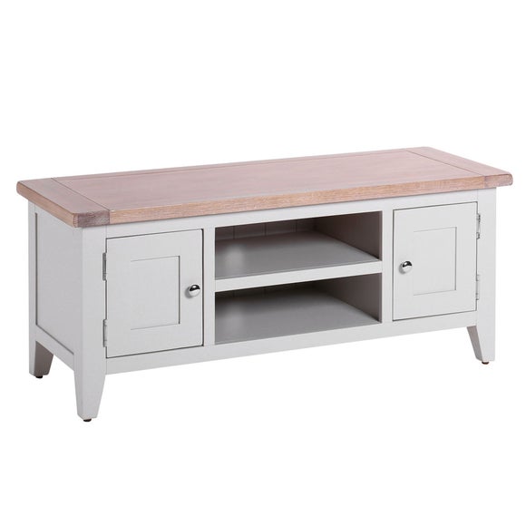 This 2 Door 1 Shelf TV Unit will add a real country house feel to your living room. In fashionable dark grey with a contrasting chalked oak top, this impressive unit has a central shelf to look after your DVD player & digital receiver & two useful cupboards for stowing all of your home entertainment. The TV Unit has an accessible hole in the back that takes care of any unsightly cables & has polished steel knobs on the cupboard doors that add a really stylish finishing touch. Choose from natural chalked oak or our 3 elegantly painted versions to suit your unique style. ...