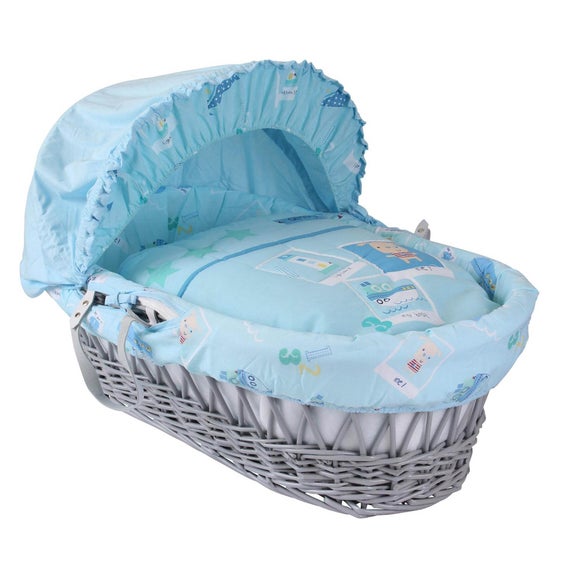 A sturdy & lightweight grey wicker Moses basket complimented with cool blue Ahoy bedding. Perfect for a baby boy's first bed, the character bedding features a sailor puppy on a nautical adventure. Suitable from birth to a maximum weight of 9kg (or until baby begins to roll over, pull themselves up or sit unaided). Comes complete with an adjustable hood, padded liner, two carry handles, coverlet, & a mattress.