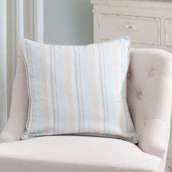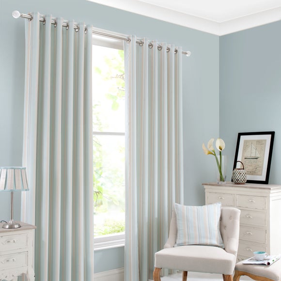 Lighten up your home with our cream & duck egg blue striped lined eyelet curtains, available to buy online today in a choice of sizes. Freshen up your home with our blue striped curtains Featuring a pattern of thin stripes in refreshing duck egg & cream tones, our lined window dressings will create a light & airy feel for your room. Made with a thick polyester lining that stops the colour & pattern from fading, our striped drapes will also block out unwanted light disturbances & cold draughts. Update your room easily & quickly with our blue eyelet drapes With sturdy metal loops across the top, our eyelet curtains can easily be installed on your curtain pole in a matter of minutes, leaving you more time to sit back, relax & enjoy your updated decor. Simple both to hang & use, our readymade window dressings are a practical addition to your bedroom or living room & an easy way to update your room without the hassle of redecorating. Please note: This product is subject to stock availability. Ask Dunelm a question Brand Dunelm Colours available One colour available in Duck Egg (Blue) Composition Face 100% polyester, Lining 100% polyester Curtain type Eyelet Lining Lined Material Polyester Pack size One pair of curtains Pattern Patterned Sizes available W 117cm (46") x Drops available 137cm (54"), 182cm (72"), 228cm (90"), W 168cm (66") x Drops available 137cm (54"), 182cm (72"), 228cm (90"), W 228cm (90") x Drops available 137cm (54"), 182cm (72"), 228cm (90") Style Striped Washing instructions Dry clean