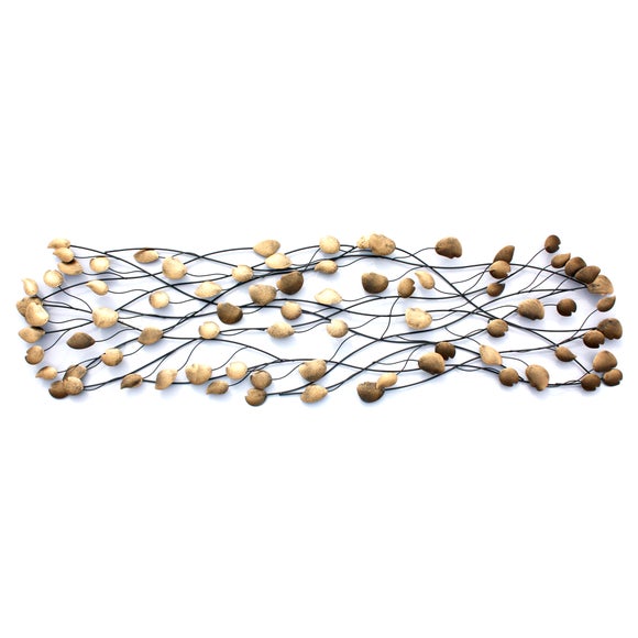 Give your home a vibrant decorative finish by hanging this bronze & gold leaf wall art to your bare walls, for an eye-catching update to your décor. • Bronze & gold leaf design• Long length• Hanging or freestanding Featuring bronze & gold leaves in a twisting black stem design, our unique leaf wall art will add an eye-catching update to your contemporary hallway or living room wall. Long in length for a striking style, our bronze & gold art can either be hung onto your wall or act as a freestanding ornament on your shelf or sideboard, offering versatility when decorating your home. With a durable metal frame, our sturdy leaf ornament is designed to provide long lasting quality for your home. Brand Dunelm Care instructions Wipe clean with a soft cloth Colours available One colour available in Gold Material Metal Pack size One wall art Sizes available One size available in 38cm x 150cm (15" x 59") ...