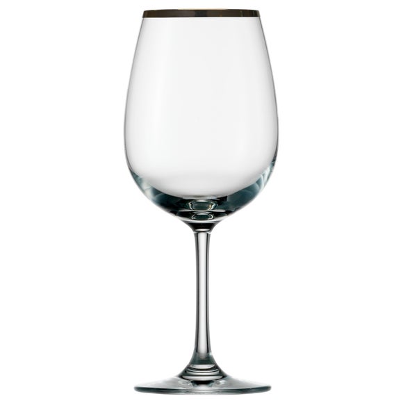 Available to purchase online today, our silver rimmed wine glasses are perfect to use for any occasion & will bring some class to your home. Add a touch of sophistication to your parties with our silver glasses Stylishly designed to savour the delicious taste of your favourite wine, our sleek wine glasses feature a silver rim design, enhancing the elegance of your kitchen. Our silver wine glasses are perfect to use for dinner parties, romantic meals with your partner or to simply relax in the evening after a long day at work. To ensure our stylish wine glasses are kept in the same fantastic condition as the day you bought it, simply hand wash them in warm soapy water. Please note: This product is subject to stock availability. Ask Dunelm a question Brand Dunelm Care instructions Hand wash in warm soapy water Colours available One colour available in Silver Material Glass Pack size One pack of four wine glasses Sizes available One size available in H 21cm (8") ...