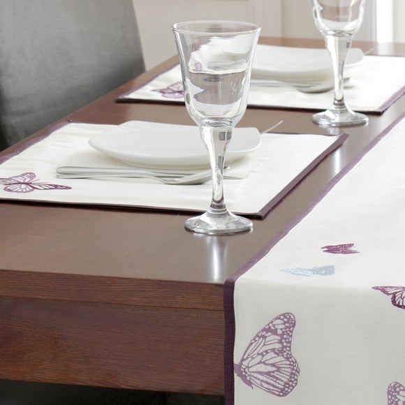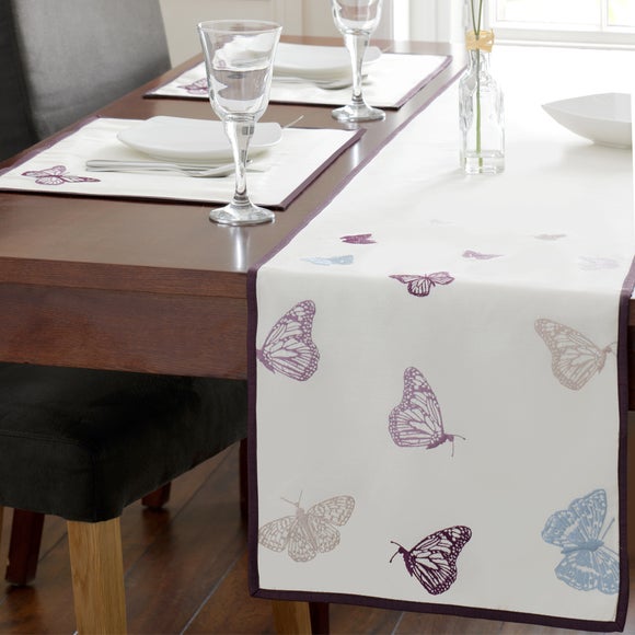 Decorated with an array of colourful embroidered butterflies, our natural & plum table runner will add a pretty & practical touch to your dining table.• Embroidered butterfly design• Polyester & cotton blend• Available in two sizes• Machine washable Decorated with embroidered butterflies in soft colours & a piped edge against a neutral background our patterned table runner will create a light, fresh & elegant feel for a dining room. Made from a durable blend of polyester & cotton, our butterfly runner will provide protection for your table from hot plates & dishes as well as preserving your surfaces from spillages when dishing up dinner. Our butterfly themed table runner is also available in a choice of two sizes to suit your table, & can be used to dress up a table for guests or provide everyday use at your family meal. Easy to care for, our violet table cover needs only a quick machine wash will keep it looking clean & fresh without hassle. Brand Dunelm Colours available One colour available in Multi Coloured Composition Face 100% polyester, Reverse 56% polyester, 44% cotton Drying instructions Tumble dry on a low heat setting Ironing instructions Iron on a cool setting Material Polyester, cotton Pack size One runner Pattern Patterned Sizes available Small 35cm x 182cm (14" x 72"), Large 35cm x 228cm (14" x 90") Washing instructions Machine washable ...