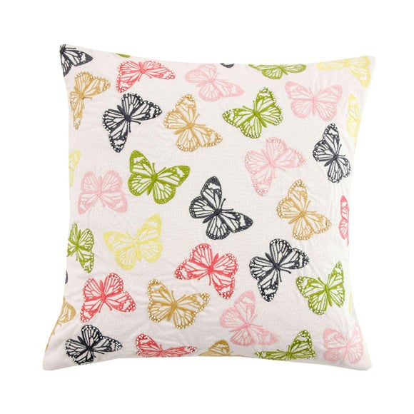 Beautifully embroidered with a butterfly pattern in shades of yellow, green, pink & grey, this square cushion brings natural elegance to your room. • Embroidered butterfly pattern• Multi coloured design• Cotton cover• Feather filling Featuring an embroidered butterfly design in yellow, green, pink & grey on a natural background, this patterned cushion complements your décor with a look of natural grace. Filled with a light & fluffy feather filling with a soft pure cotton cover, this butterfly cushion provides luxurious extra comfort for your chair or sofa & is durable to provide long lasting everyday use. Brand Dunelm Colours available One colour available in Multi Coloured Composition Face 100% cotton, Filling 100% feathers Cover Removable Filling Feather Material Cotton Pack size One cushion Sizes available One size available in 45cm x 45cm (18" x 18") Style Animal Washing instructions Dry clean ...