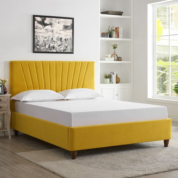 Upholstered in a luxe velvet fabric finished in a stunning silver colour way, the modern Lexie bed frame is perfect for adding a touch of style to your bedroom. This beautiful bed frame features a sumptuous foam-padded headboard, complete with a contemporary stitched sunburst design & contrasting dark stained wooden legs. Please note, unfortunately we cannot deliver this item to Northern Ireland or the Channel Islands.
