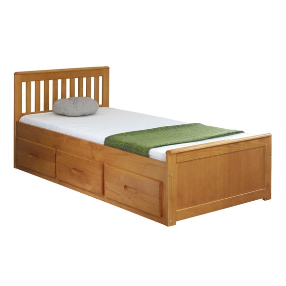 * Traditional wooden pine construction with a painted finish * Solid slatted base- allows air to be circulated around your mattress * Elegant high slatted headboard * 3 drawers- can be placed on either side based on your preference The Mission Storage Bed gives you a traditional single bed with a slatted headboard & a strong, durable construction which is crafted from pine wood. The bed also boasts 3 drawers for useful storage that will help you to organise your bedroom. During assembly, you also have the option to install the drawers on either side of the bed to suit your preference. Please note, unfortunately we cannot deliver this item to the Channel Islands.