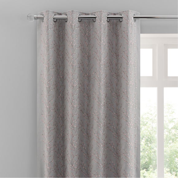 Crafted from lightly textured fabric, these soft grey eyelet curtains are adorned with an array of delicately embroidered budding branches in a beautiful blush colour. The modern eyelet header allows for smooth movement across your curtain pole & creates loose, elegant folds for a sophisticated finish. Fully lined for added privacy & an enhanced drape, these unique curtains are available in a variety of sizes to suit your requirements. Please note: these curtains are sold as a pair. ...