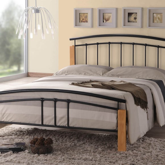 * Contemporary metal & beech construction * Sprung slatted base- for added support & comfort * Sleek curved metal slatted headboard & low footboard A modern bed frame with silver framework, beech posts & a slatted bed base. This contemporary bed frame will make a great centrepiece to any modern room. The silver framework & beech posts contrast beautifully while the simple yet stylish design creates a truly stunning effect. Please note, unfortunately we cannot deliver this item to the Channel Islands.