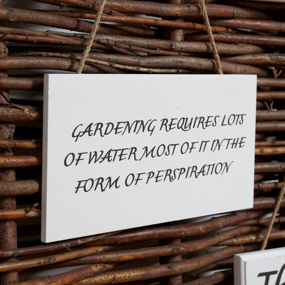 Available to buy online now, this garden plaque is perfect for adding a cheeky, playful touch to wherever you decide to place it. The perfect plaque to add a touch of fun to your decor Ideal for green fingered gardening enthusiasts, this fun hanging plaque features flowing black writing against a white base with the cheeky phrase Garden requires lots of water most of it in the form of perspiration. Crafted from durable wood with an attached rope cord, its couldnt be more simple to hang this word plaque from fixtures in your home, instantly infusing your home with playful charm & traditional appeal. Please note: This product is subject to stock availability. Brand Dunelm Care instructions Wipe clean with a soft cloth Colours available One colour available in White Material Wood Pack size One wall plaque Sizes available One size available in 25cm x 12cm (10" x 5") ...