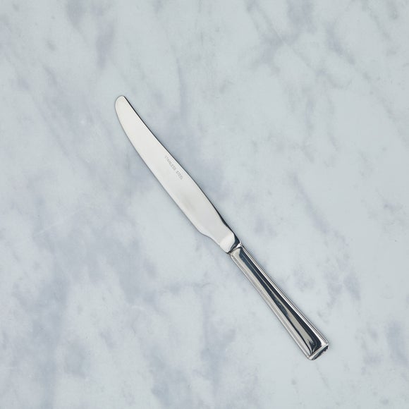 Finished with a classic lined border in a mirror finish, this silver knife will add an elegant touch to your existing cutlery set. • Silver engraved border• Dishwasher safe Help present your dining table in a smart & elegant way with this patterned knife that will mix with existing cutlery to achieve a classic look. Comfortable to hold with a flat bottom & an engraved, bordered handle, this single metal knife is safe to use in the dishwasher so it can be effortlessly cleaned before its next use. Brand Dunelm Category Knives Colours available One colour available in Silver Dishwasher safe Suitable Material Stainless steel Pack size One knife Pattern Patterned Sizes available One size available in L 22cm (9") ...