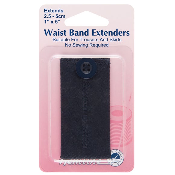 Now available to buy online in a choice of colours, this waistband extender requires no sewing simply fastening onto your existing button. This waistband extender makes it easy to alter your trousers & skirts Easy to fasten onto your button fastener on a pair of trousers or a skirt, this waist extender will give you extra breathing space of 1" to 2", ideal to relieve that bloated feeling after a meal. Ideal to easily adapt trousers & skirts during pregnancy or during a period of weight gain, this waist expander is available in a choice of colours to match a range of garments. Please note: This product is subject to stock availability. Brand Hemline Colours available Black, Denim, Navy Material Fabric Sizes available One size available in L 5cm (2") Washing instructions Sponge clean