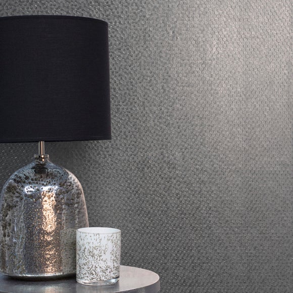 Crafted with a stunning foil texture, this stylish silver wallpaper features a contemporary hexagonal design & an opulent metallic finish. This wallpaper is ideal for bringing a modern edge to your décor & is great to complement a variety of decorative styles & colourways. Easily applied & positioned by pasting the paper, this wallpaper makes a striking feature wall. Hang this wallpaper using the traditional paste the paper application method. For more information on applying your wallpaper, take a look at our handy [wallpaper buying guide.] (https://www.dunelm.com/info/buying-guides/wallpaper-buying-guideapply-paste-the-paper-&-wall)
