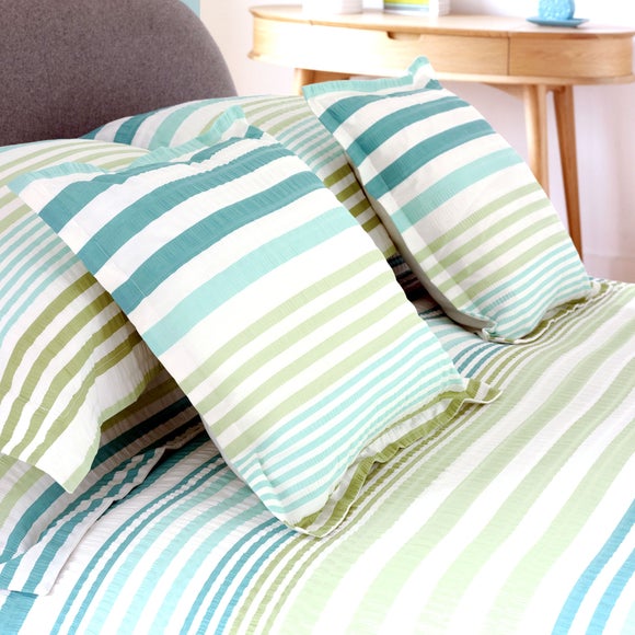 Available to purchase online today, this striped oxford pillowcase offers a decorative finish to cover your pillows in your bedroom.A striped & colourful polycotton pillowcase Made in a traditional oxford style with a bordered edge, this patterned pillowcase displays teal & green stripes running through the fabric with a textured finish. Perfect for covering your base pillow with, this oxford teal pillow cover will give your room a bright touch while offering you comfort & support. Part of the Seattle Seersucker Bedding range, you can coordinate this colourful pillowcase with the matching quilt cover set & curtains which are available separately online. Please note: This product is subject to stock availability. Brand Dunelm Colours available One colour available in Teal (Blue) Composition 52% polyester, 48% cotton Drying instructions Tumble dry on a low heat setting Ironing instructions Iron on a cool setting Material Polycotton Pack size One oxford pillowcase Pattern Patterned Pillowcase style Oxford Sizes available One size available in 50cm x 75cm (20" x 29") Washing instructions Machine washable ...