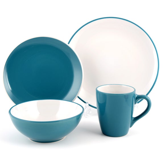 Available to order online today, our complete dinner set offers a bold, modern style in vibrant teal blue to liven up your dinner table. Our teal dinner set will add a fresh colour scheme to your dining table Embracing a gorgeously vibrant teal blue colour way, our glossy dinnerware has a contemporary style that will effortlessly refresh your dining accessories. Made from strong stoneware that can be used in the microwave & dishwasher, our colourful crockery is a practical & versatile choice for your home. With four dinner plates, four side plates, four bowls & four mugs in a set, our blue dining set is ideal for seating a table of four for everyday use. Take a look at similar items from our Teal Spectrum Collection to coordinate your dining table with a bold, contemporary look. Please note: This product is subject to stock availability. Ask Dunelm a question Brand Spectrum Colours available One colour available in Teal (Blue) Dishwasher safe Suitable Material Stoneware Microwave safe Suitable Pack size Four dinner plates, four side plates, four bowls, four mugs Pattern Patterned Sizes available Dinner plate Dia. 27cm (11") x H 3cm (1"), Side plate Dia. 21cm (8") x H 2cm (1"), Bowl Dia. 14cm (6") X H 8cm (3"), Mug Dia. 9cm (4") x H 11cm (4") ...