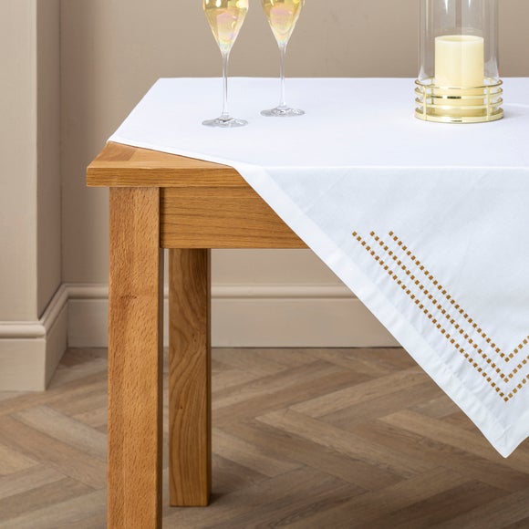 Finished with gold embroidered detailing in each corner giving a royal look, this 5A Fifth Avenue table cloth in a sophisticated white colourway is crafted from a luxurious 100% cotton. Available in a smaller size.