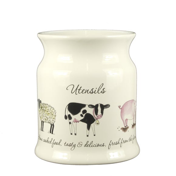 Now available to buy online today, our farmyard utensils canister with a cute animal design will makes a convenient storage pot for your kitchen accessories. Keep your kitchen surfaces tidy with our utensils canister Featuring a selection of farmyard animal cartoons & cheerful motto, our patterned utensils jar will add a fun, country style to your kitchen, brightening it up beautifully with a personal look. A safe place to keep your utensils when preparing food, our earthenware jar will allow you to free up space on your kitchen counter whilst keeping everything within your grasp for quick & simple cooking. Why not accessorise your kitchen with similar items from our Bakewell Farm Collection, to create a novel, farm animal theme that youre sure to love. Please note: This product is subject to stock availability Ask Dunelm a question Brand Dunelm Care instructions Hand wash in warm soapy water Colours available One colour available in Blue Material Earthenware Pack size One utensil canister Pattern Novelty Sizes available One size available in Dia. 12cm (5") x H 13cm (5") ...