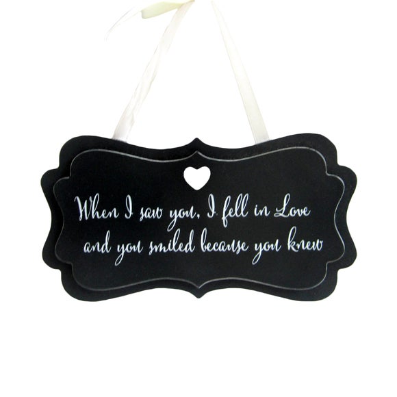 Elegantly shaped with a blackboard design, this wedding sign is stylishly printed with flowing chalk style lettering expressing romantic sentiments. • Blackboard design• Romantic sentiment in white lettering• White ribbon hanger Ideal for expressing a romantic message to the one you love on your special day, this wedding sign features a blackboard style design with the words ' When I saw you I fell in love with you & you smiled because you knew'. Elegantly shaped with a cut out heart shape & hung from a white ribbon, this romantic sign can be easily suspended in the desired location at your wedding venue or in your home & would complement traditional wedding decors. Available for use as an addition to your wedding decor, this black love sign is also ideal as a home decoration celebrating love at first sight. Brand Dunelm Care instructions Wipe clean with a soft cloth Colours available One colour available in Black Material MDF Pack size One sign Pattern Patterned Sizes available One size available in 22cm x 11cm (9" x 4") ...