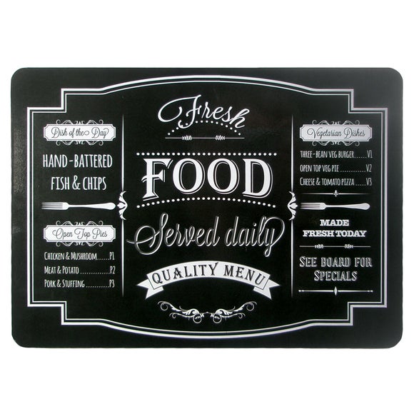 Protect your dining table & complement a contemporary theme with our pack of four novelty placemats, featuring chalkboard menu design with white lettering. • Set of four placemats• Black chalkboard design• Menu style lettering Featuring a black chalkboard style design with white border & menu style lettering listing various food dishes, our novelty placemats bring a contemporary feel to your interior. Designed with a cork backing, our set of chalkboard placemats rest smoothly against your table to prevent scratches, so you can arrange your dinner plates & protect your surfaces from heat & food stains. Brand Dunelm Care instructions Wipe clean with a damp cloth Colours available One colour available in Black Material Cork Pack size Four placemats Sizes available One size available in 21cm x 29cm (8" x 11") ...