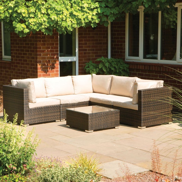 Create a stylish & comfortable place to relax into your garden or conservatory with our brown rattan corner set with comfortable cream cushions. ? Suitable for indoor or outdoor use? Footstool & coffee table included? Cushions included? Easy to move around? 1 year guarantee? Self assembly required Ideal for use either inside in your conservatory or outside on your patio, our brown rattan style corner sofa will provide a comfortable & durable place to sit & relax in the warmer weather. With a footstool & coffee table included, our garden furniture will create a stylish centre to gather around in your home. Featuring plump cream cushions on the sofa for added comfort, our sofa comes as three individual corner pieces & two middle pieces so that you can easily move our furniture around to suit your needs. With a strong aluminium frame, our corner set comes with a one year guarantee for added peace of mind & is quick & easy to assemble in your home. Ask Dunelm a question Assembly Full assembly required Brand Dunelm Care instructions Wipe clean with a soft cloth Colours available One colour available in Brown Finish Rattan effect guarantee 1 year Material Aluminium, polyrattan No of seats 6 seater Pack size Three corner units, two middle units, one footrest, one coffee table Sizes available Corner unit W 79cm (31") x D 79cm (31") x H 70cm (28"), Middle unit W 69cm (27") x D 79cm (31") x H 70cm (28"), Table W 70cm (27") x D 70cm (27") x H 33cm (13"), Footrest W 70cm (27") x D 70cm (27") x H 33cm (13") Weather care Suitable for outdoor use, cover during wet weather Weight Table 42kg, Chair 7kg, Footrest 3kg ...