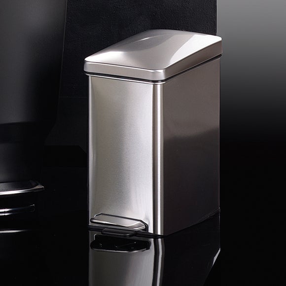 Available to purchase online today, our stylish & discrete ten litre pedal bin is a must have accessory. Keep your home tidy with our small stainless steel bin The profile pedal bin has a durable all-steel pedal to help ensure the bin will work smoothly & quietly for years & comes with a 10 year guarantee, giving you piece of mind with this purchase. Its slim profile shape makes this silver bin a great fit under a desk in your office or in the corner of your bathroom, while its customised handles on the inner bucket are designed to hold a plastic carrier bag securely in place, so you can make use of the left over carrier bags in the house. Other simplehuman products are available to purchase online separately to help keep your kitchen clean & tidy. Please note: This product is subject to stock availability. Ask Dunelm a question Brand simplehuman Capacity 10 litres Care instructions Wipe clean with a soft cloth Colours available One colour available in Stainless Steel guarantee 10 years Material Plastic, stainless steel Pack size One pedal bin Sizes available One size available in W 17cm (7") x L 38cm (15") x H 35cm (14") ...