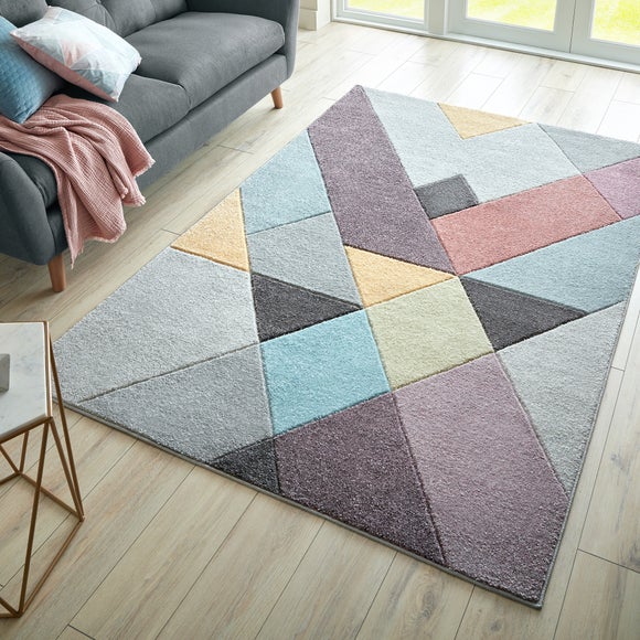* Geometric Design* Bright Colourway* 100% Polypropylene Pile The Mika Rug pairs a large scale geometric design with h&-carved detailing for maximum impact. In a bright palette of pretty pastels Mika makes a stylish statement in any space. In 100% polypropylene pile, the Mika Rug is ideal for adding a soft feel to high-traffic spaces. We love using the Mika Rug in bedrooms, living rooms & a very cute addition to kids rooms!A small amount of fibre loss is normal. Do not pull loose fibres, just trim with scissors. Safe for use with anti-slip backing on a heated floor. Use a suction type vacuum