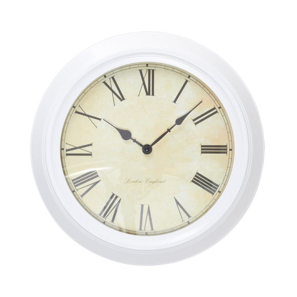 Make keeping an eye on the time in your kitchen or living room easy with our large round roman numerals clock, available in a choice of colours.? Roman numerals? Fits to the wall? Available in a range of colours Featuring large roman numerals on a parchment colour background, our clock has clear numbers so that telling the time when busy or in a rush is simple. Our large clock is ideal for your living room or kitchen & hangs from the wall so that it is easy to keep within view. Made from durable metal for sturdy long lasting use, our easy care clock is available in a range of colours so that you can be sure to find the right match for your room. Please note: This product requires 1x AA battery. Batteries are not included. Brand Dunelm Care instructions Wipe clean with a soft cloth Colours available Black, Red, Cream, Bronze Material Metal Pack size One clock Sizes available One size available in Dia. 40cm (16") ...