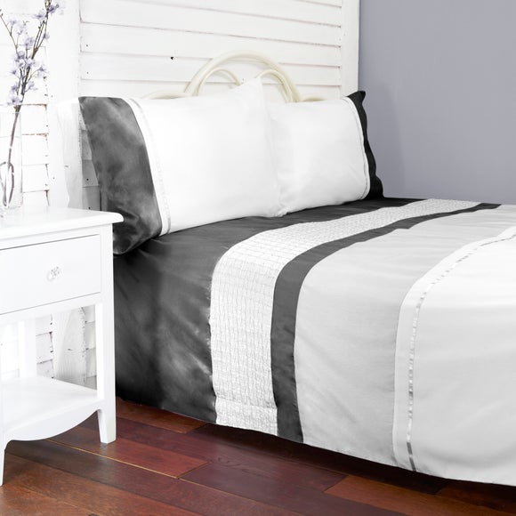 Add an elegant air to your bedroom with our gorgeous Silver Crinkle Panel Quilt Cover Set, available to purchase online today. Update your room with this stylish set Instantly make your bedroom more glamourous with our gorgeous duvet cover set, featuring a soft silver sheen & a subtle crinkled panel detailing. Perfect for use in your own bedroom or great to keep as a spare to impress guests staying in your spare bedroom, with a range of sizes to choose from, this is a must have bed linen set for your home. An elegant & practical quilt cover & pillowcase set Made from durable yet soft material, our elegant bedding set is not only stylish, but is also extremely practical. Our duvet cover set has both machine washable & tumble dry properties, which makes maintaining the sheen & quality of your bed linen collection an easy & convenient task. Please note: This product is subject to stock availability. Brand Dunelm Colours available One colour available in Silver Composition Face Drying instructions Tumble dry on a low heat setting Ironing instructions Iron on a low setting Material Polyester Pack size One duvet cover, two pillow cases Pattern Patterned Sizes available Single 135cm x 200cm (53" x 79"), Double 200cm x 200cm (79" x 79"), Kingsize 230cm x 220cm (91" x 87") Washing instructions Machine washable