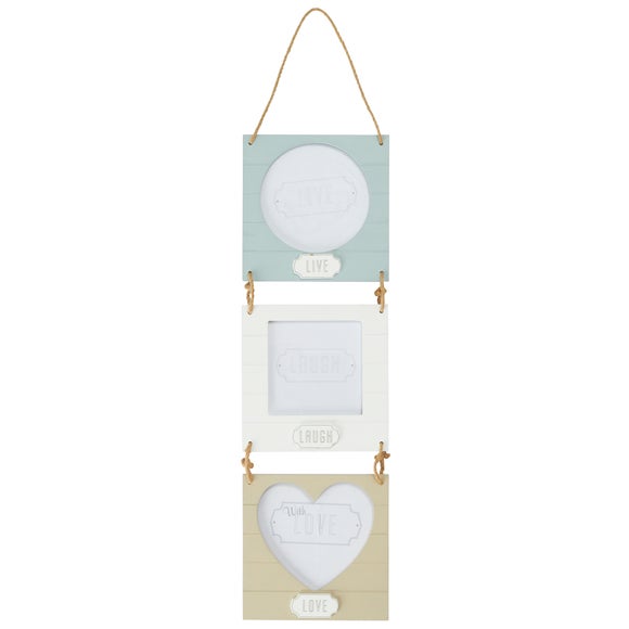 Display photos of your cherished moments with friends & family with our hanging photo frame, available to buy online today. Present your favourite photo in our three aperture photo frame Featuring three square frames with different shaped apertures for photos, our cream, blue & white photo frame will brighten up your otherwise blank walls. Ideal for showing off photos of your favourite moments with family & friends, our hanging photo display is attached by rope for a rustic style & features a large rope loop at the top for easy hanging. Crafted from durable wood for long lasting quality, our three photo frame can easily be kept at its finest with just a quick wipe with a soft cloth. This photo frame can hold three 13cm x 13cm (5" x 5") photos. Please note: This product is subject to stock availability. Brand Dunelm Capacity Three photos Care instructions Wipe clean with a soft cloth Colours available One colour available in Multi Coloured Material Wood Pack size One photo frame Sizes available One size available in 15cm x 52cm (6" x 21") ...