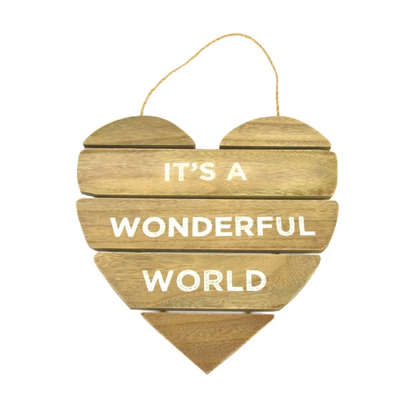 Decorate your living space, hallway, or bedroom with our heart wall plaque & bring a homely decorative touch to your interior. • Wooden wall plaque• Mountable display • Heart shaped design• ' It's a wonderful world' lettering• Natural wood construction Bring a touch of charm to your walls with our mountable wooden plaque, featuring wood slats formed into a heart shape with attached hanging hoop & ' It's a wonderful world' lettering across the face. Ideal for hanging on an empty wall space in your hallway or living room, our heart plaque updates you décor with homely charm & a happy message, & is formed from natural wood that provides a robust & durable addition to your home. Brand Dunelm Care instructions Wipe clean with a damp cloth Colours available One colour available in Wood (Brown) Material Wood Pack size One plaque Sizes available One size available in 29cm x 29cm (11" x 11") ...