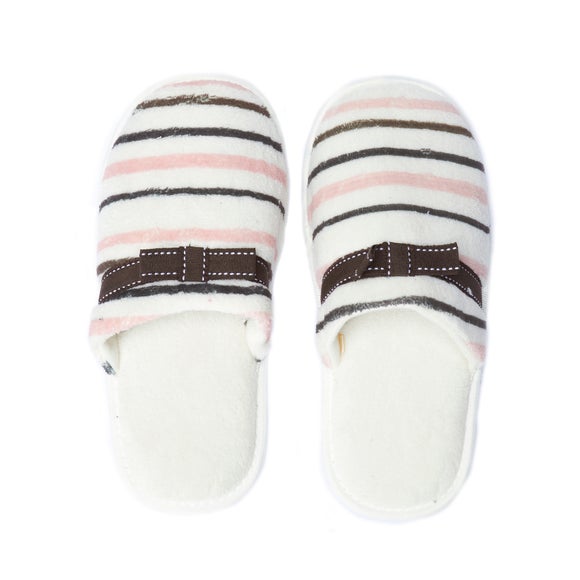 Enjoy lounging in comfort with our soft and comfortable striped slippers, available to buy online today in a choice of colours.Keep your feet snug and warm with our soft slippersFeaturing a charming striped pattern available in a choice of beautiful colours, our soft slippers are perfect footwear for relaxing around the home. Made from a super soft polyester fabric and padded base, our striped slippers offer amazing comfort and will protect your feet from the cold floors around your home. Machine washable for easy care, our house slippers are available in a choice of sizes so you are sure to find the perfect fit for you.Please note: This product is subject to stock availability. Ask Dunelm a question Brand Dunelm Colours available Fuchsia (Pink), Cream Drying instructions Line dry