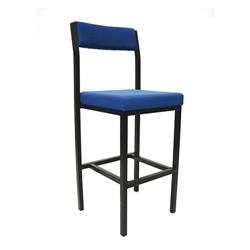 High stool with integrated back rest. Ideal for canteens, restaurants, work benches and more. Foot bar provides easy ascent and descent to the seat. 1 inch square section steel frame with a black epoxy coating. Flame retardant fabric.