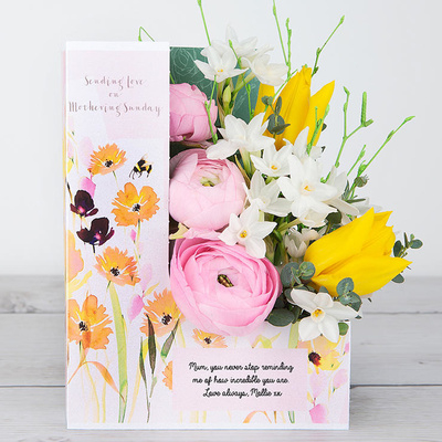 Pops of lilac, lime & cream coloured blooms are framed by the prettiest bee & wildflower themed card. A gorgeous way to let Mum know just how amazing she is. ' Happy Mother's Day' will be printed on the front of the card. ...