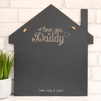 He makes the best packed lunches, tells the funniest jokes & is the first person you run to when you get home. So why not let daddy know just how much he means to you & treat him to our personalised chalkboard? Made from natural slate with a rustic rope handle, the large house-shaped slate chalkboard reads ' Love You Daddy' in a cute cursive font & is finished with three heart icons, making it perfect for writing his lunch box shopping lists (and silly jokes!) You can personalise the board with a message to be engraved along the bottom of the board in a childlike font for that extra special touch.A great birthday or Father's Day gift, perfect for jotting down reminders!
