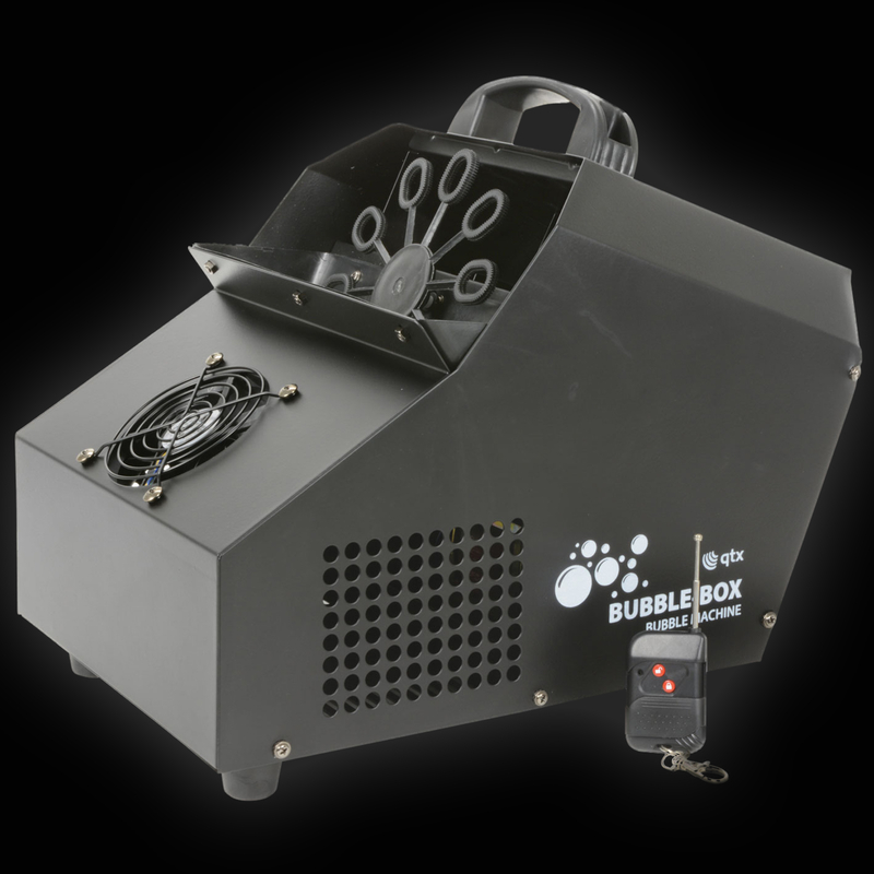 Flood your dance floor with bubbles for outstanding party effects! Better still why not make them UV so that they fluoresce under UV blacklight? The Bubble Box fills your party with bubbles that dance around your venue for a fun party atmosphere or even for stage effects. Use UV bubble fluid & create bubbles that fluoresce under UV blacklight for fantastic special effects. With a choice of wired & wireless remote control, you have full control of the bubble flow. High output of bubbles from a compact machine 3 fans (1 front, 2 rear) for optimum air flow Quick drain tap at the rear Supplied with wired & wireless remote control Power supply: 230 Vac, 50 Hz (IEC) Power consumption: 26 W Standard UK Plug Number of wheels: 1 Number of wands per wheel: 10RPM: 45 rpm Fluid capacity: 0.7m Remote control frequency: 433.92 M Hz Dimensions: 390 x 300 x 255mm Weight: 4.5kg